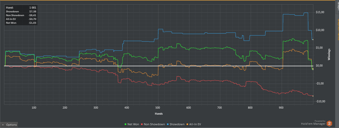 Итог: Красная линия Мне говорит о том что было и раньше - слишком лузово играю из-за этого попадаю в ситуации где Моя рука слабее и приходится сдаваться. Постараюсь завтра сыграть еще тайтовей где-то в районе 24\20\10.