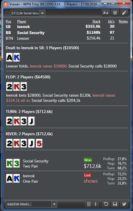 Сегодня выходной. Наверное, первый выходной за долгое последнее время, который я себе делаю со спокойным сердцем и ощущением того, что все хорошо. Вчера был хедзап в турнире за 5,5, который затянулся аж на 1,5 часа, стеки были почти по 80 бб, да и особого преимущества над оппонентом я не чувствовала. Я так измоталась за это время, что когда все это кончилось моей победой, долго сидела на полу и смотрела в одну точку, а пока сидела, на плите закипали магазинные вареники. В голове не было ничего, одна звенящая пустота, правда, где-то вдалеке все-таки стояла мысль - "Выиграла. Опять". А потом были велосипеды и дивный осенний день, была подруга рядом и пасторальные пейзажи с тракторятами и свежим сеном скрученным в тюки. А что сегодня? А сегодня сделала пробный кэшаутик с пати, подумала - уже можно чуть-чуть. И сегодня я не думаю про раздачи, и диапазоны, про то что недотрибечиваю, и про то, что много проигрываю без шоудауна, сегодня я просто живу. Вот вам сентябрьские настроения и скрин моей маленькой победы.