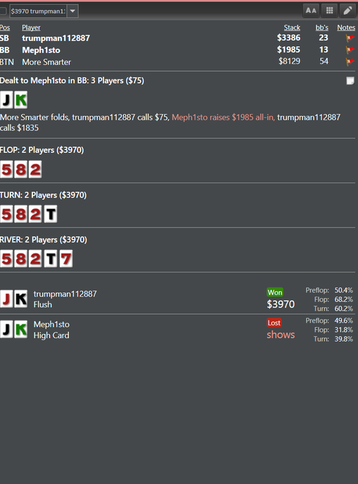 короткая сессия, БЧП трепали мои нервы, 3 раза звонил в саппорт, 4 раза проиграл в хедз апе, небыло связи с румом и не только у меня а у 1/4 игроков, в хедз апе 2 раза 1 и тот же рег просто забирал у меня блаинды а я ничего не смог сделать, написал им письмо надеюсь вернут часть $, проблема исходила от них и они признали это, у меня ХХ и ИД турниров, если нифига не вернут сниму все деньги и ориведерчи, я плачу 10% рейка за каждый турнир а не через раз.....