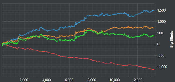 эти руки резюмируют всю сессию, все 3 руки против 1 и того же оппа за 1 и тем же столом.....=)) катал долго чтоб отыгратся, около 12 часов, и в итоге сумел.