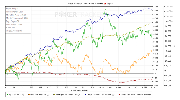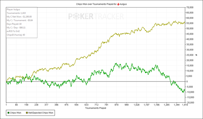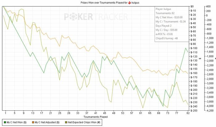 Последние 400 турниров с учетом трешака который был в предыдущем после вышли со средним чипом в +25 фишек, что не может не огорчать. Даже не понимаю тильтую ли я + голова забита проблемами в реале, поэтому возьму перерыв пару дней, поднять теорию и отдохнуть