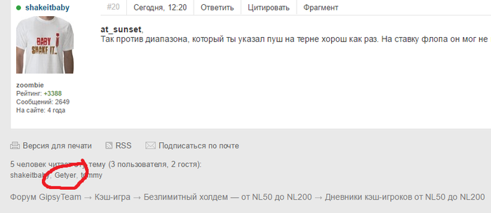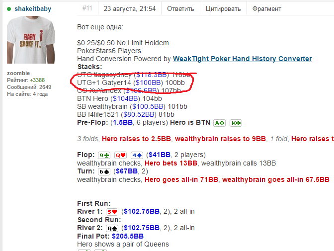 Мы смотрим спектр конкретного оппонента. На данный момент на 50к рук это 88+, AJo+,AJs+, KQo, KQs, JTs. Всё! Конечно нам хочется, чтобы там было много коннекторов, слабых одномастных тузов и прочего, но там этого нет. (Примечание: да у него был один раз A2s и 98s, но это он оба раза закрыл колд4бет от короткого фиша, потому что просмто по шансам) Ок, с ними он не дошел до ШД, дисперсия и прочее, в общем что-то добавим из коннекторов, но это все равно не выведет наш пуш в плюс. К тому же часть JT опп мог через чек-рейз флопа сыграть, например, а может и часть гатшотов, а вот вдруг, но и это не будем предполагать, пусть все свои слабые руки он сыграл колом и пришел к тёрну с максимально широким спектром. Далее перед нами нулевой игрок НЛ50, а мы хотим, чтобы он сфолдил попадание дамы в 4бет поте? Нет, конечно, зачем он вообще колил тогда. Более того на наш пуш еще и не факт, что JJ-TT опп выбрасывает в 100% случаев. Так как реально пуш выглядит блефово, ведь вышел абсолютный бланк, чего бы мы испугались с оверпарами?