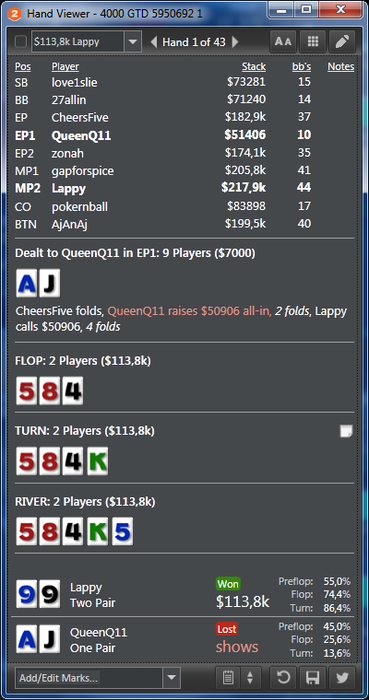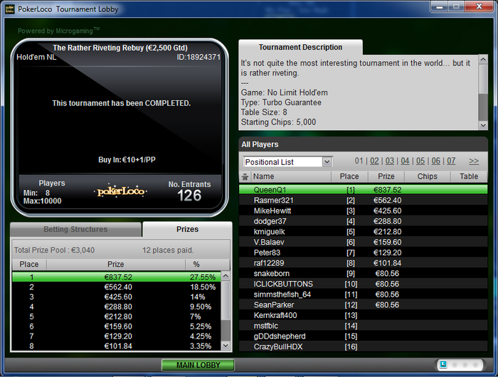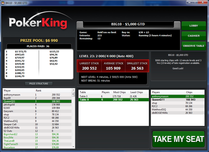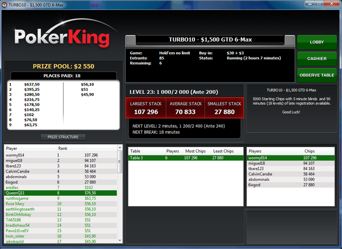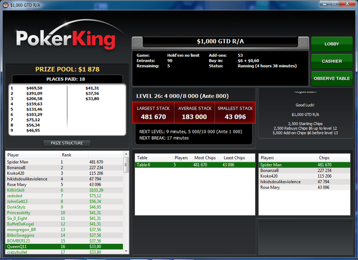 -очень долгая 3-5ч ,по этому заходить в посл час не очень хорошая затея,дают всего 10-15бб максимум -фотки будут позже)) -на данный момент вторая половинка поддерживает...планирую уделять много времени покеру!!!