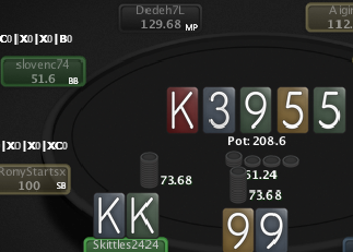 UTG shows K K (a full house, Kings full of Fives)