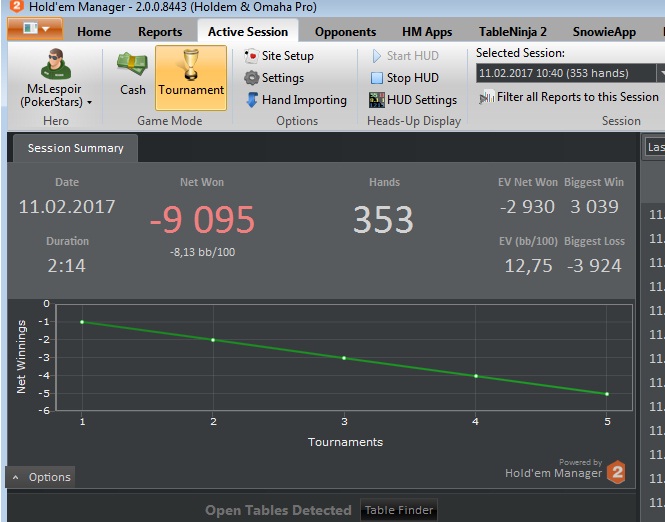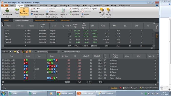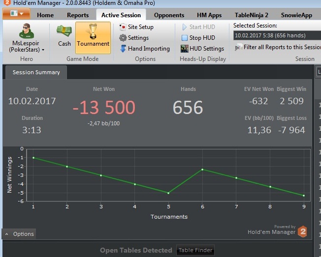 Отыграла сегодня. В основном 45 макс - 1, 1 мтт, 6 штук 1-180 (в них без финалок). как то так. Вообщем необходимо повышать количество столов, а то я физически не успею откатать нужное количество турниров. Играя одновременно 6 столов регспидов дистанция отыгрывается очень медленно. У меня нет нормального монитора, играю с ноутбука. Ну значит придется накладывать столы друг на друга. ну а как еще? Тем более я скучаю уже за 6 столами.