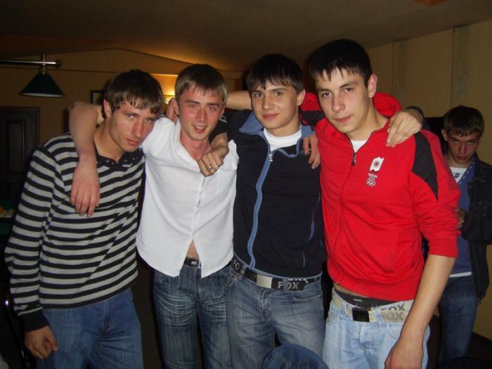 Щас посмотрел, нет ни одной фотки в электронном виде, выцепил с контакта у друга фотку 7 летней давности. я второй справа накинте еще 25 кг, морду пошире и буду я нынешний PS фотка с отмечания 1го сентября в самой разгульной комнате в нашей общаге 534, хозяева комнаты я и еще два парня (серьезный парень слева и тот что на заднем плане)