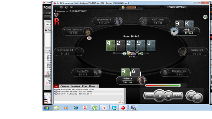 По тёрну в общем приблизительно равнозначно и колл и рейз, лучше колл пожалуй (хотя рейз для защиты от дро, да и тупо на вэлью со слабых девяток, не такая уж ошибка). Ну и коллдаун ривер, адекватный размер ставки и ставим сами, если к нам приходит чек. Рейзить такой ривер в общем-то бессмысленно, ты просто превращаешь свою руку в блеф, зачем тебе это - у тебя же хорошие шансы выиграть по вскрытию. Нормальные люди (не персонаж из раздачи) тут колить не будут ничего кроме фулов и флэшей. В связи с этим, общий совет, который в первую же очередь все тренера дают ученикам: ты должна всегда знать, ЗАЧЕМ и для ЧЕГО ты делаешь ставку. Т.е. ты должна понимать, ты ставишь в блеф, или на вэлью, или ещё зачем, а тут ты пихнула ривер и я если честно не до конца уверен, что ты бы ответила на вопрос "а на фига я вообще собственно это сделала?"