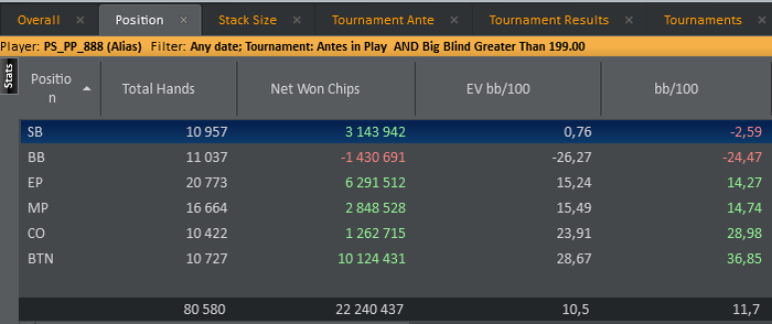 Не смотря на общее довольство качеством игры, есть некоторая просадка на СБ, вообще СБ это одна из сложных для меня позиций. Все упирается в то, что мне не понятно как играть когда люди фолдят на рейз с СБ, в среднем, порядка 38%. В ближайшее время буду думать что с этим делать, видимо придется добавлять лимпы с СБ в свою игр, либо не открывать с СБ более 35%. Иначе я не представляю как иметь на этой позиции -10\ -15евбб.