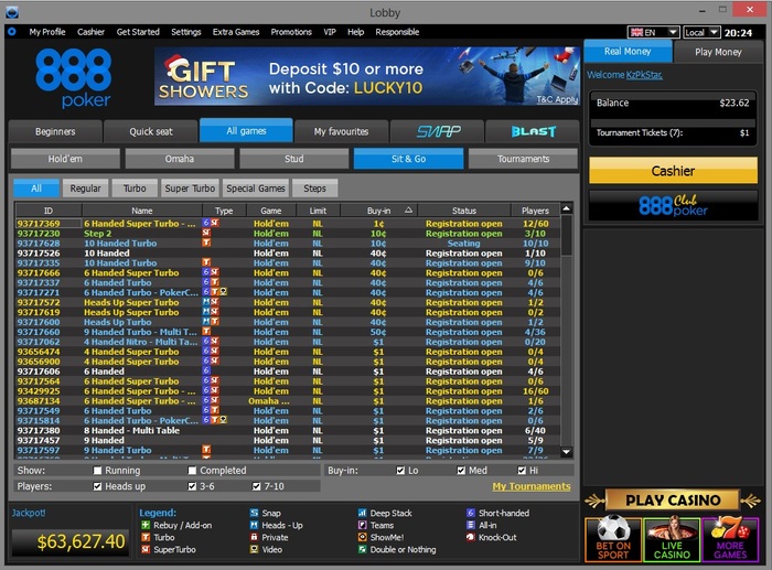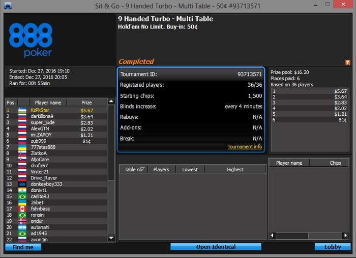 День3. играл на 888покер кеш и 36 макс по 0.50. сыграл около 15 штук. маловато. но они долго грузятся. финалов было около 7-8 штук. на финалку заходил в основном с хорошим стеком. даже чипаком. но каждый раз вылетал не доходя до хедзапа. и вот последний турнир выиграл и занял 1ое место. в кеше проиграл всего 1 бакс. а в 0.50 за сегодня выиграл в общем 10баксов