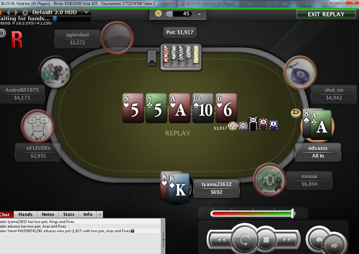 Предфиналка 45 макс. Мудь с баттона пишет что у него АА... и пушит в в меня на сб (Q/4 - фолд) и в бб... который принимает колл открывая свои AA... в итоге бт показывает QJ и идет регаться в следующий снг... Мораль раздачи такова - никогда не пизди, что у тебя АА...