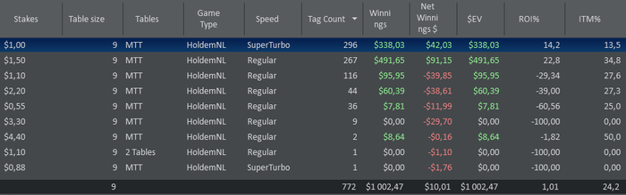 Так же подведу итоги января. Отыграно 772 турнира в +10,01 Месяц оказался провальный. Всю прибыль с снг спускал на диспу в мтт. Такова была моя тактика и я ее придерживался. Первые 2 строки снг: 1.5/90max+ 91,15 1/180max( хз чего он их как супер турбо определил) +42,03