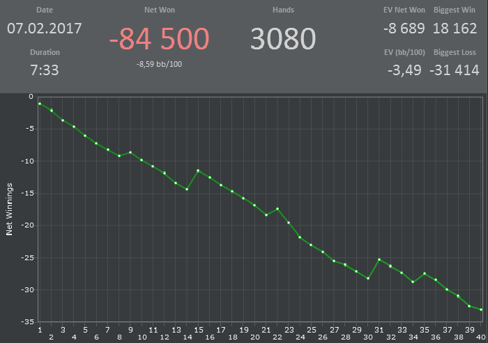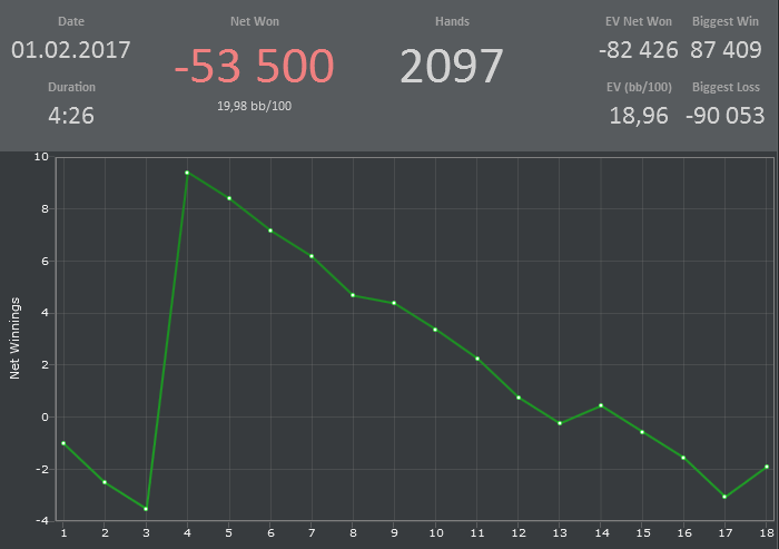 Запускаюсь около 17:00 МСК Регаю мтт до 21:00 включительно, параллельно снг нон стоп пока в пике не будет 16-18 столов. Далее играю их до тех пор пока не остается 2-3 стола, затем снова начинаю подгружать пока не наберу 16-18. В дни плотных сессий заканчиваю около 00:00. Исключения - глубокий проход в мтт, но это пока редкость.