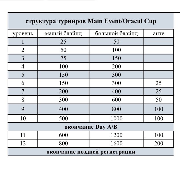 структура турниров Main Event и Oracul Cup - стартовые стеки 30.000 и 20.000 соответственно - поздняя регистрация открыта в течении 10 уровней Day A/B + 2 уровня объединнённого дня