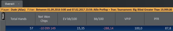 Так что, как не печально, как дисперсия не шатает, но все еще очень много работы над игрой, особенно в поздних стадиях. Надо хорошенько поработать над блайндами 4999+ так как винрейты совсем не радуют. Как я уже говорил, надо быть уверенным в том, что ты делаешь, а потом уже надеяться на положительный виток дисперсии. Надеюсь апстрик не за горами, а МТТ столами. Всем добра.