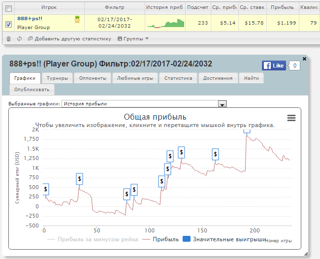 Профит:+1199$ за 223 турниров.
