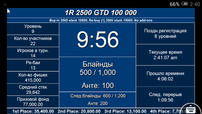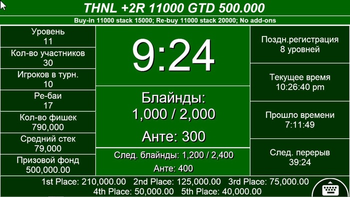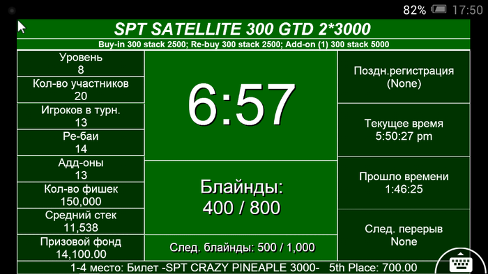 Добрый вечер! В 22.30 стартовал турнир RE-ENTRY 2000, с гарантией 80.000 Со старта 16 человек. Идёт 2 уровень, 50-100 Все игры в клубе проходят в дружественной атмосфере!