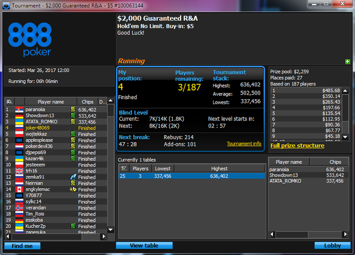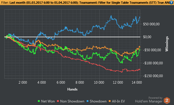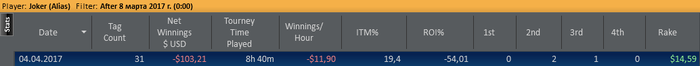 В это время проходил марафон поэтому вы знаете как развивались события. На апрель поставил аналогичную цель в 400 турниров, тем более уже 100 отыграно в марафоне, буду играть после работы. Первая неделя после отпуска конечно будет перегружена, так как по-любому никто ничего без меня не делал, а потом в обычном режиме постараюсь выдавать по 40 туриков за сессию.