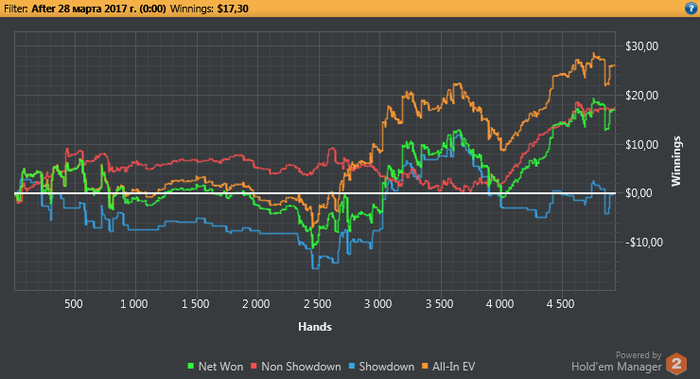 Мирный характер дня прервала четвертая сессия, ставшая для меня воистину битвой с ГСЧ не на жизнь, а на смерть. Да, да, даунстрики - это составляющая часть покера, все ОК, но я не мог смириться, что эта гадина обыграет меня на NL5 и испохабит весь день. Полтора часа меня скурпулезно и методично разделывали на части, сняв кровные 25$. Соперникам доезжало процентов 90 того, что могло бы доехать. Потом я 2,5 часа безуспешно пытался спасти ситуацию. Как только я что-то выигрывал, тут же получал ответный удар. В один момент удалось отыграть десяточку и вроде казалось - вот оно пошло, перелом. Как же - снова становится -24$. Ха, сказал я себе, - костьми лягу, но не сдамся и, наконец, в последние полчаса пятичасовой сессии, я таки отыгрался хотя бы по EV в 0 и минимизировал фактический убыток, закончив с -8,2$. Можно было отыграть и больше, но я уже был прилично уставший и решил довольствоваться статус кво.