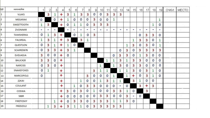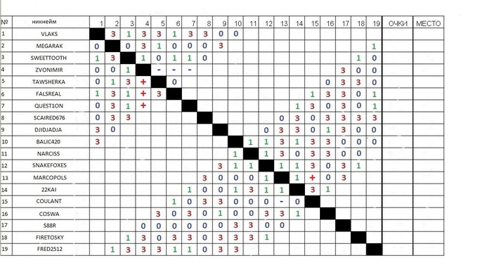 2) coulant и zvonimir пропустили хотя бы один из матчей тура (coulant 1 , zvonimir 3) , получили за это минусы. Если они не сыграют хотя бы один матч следующего тура , они снимаются с участия , и поскольку они не сыграли больше половины встреч - их результаты буду аннулированы. Пожалуйста подойдите ответственнее и доиграйте турнир как следует !