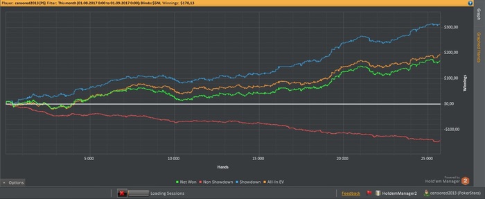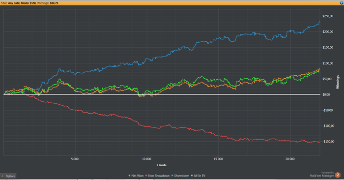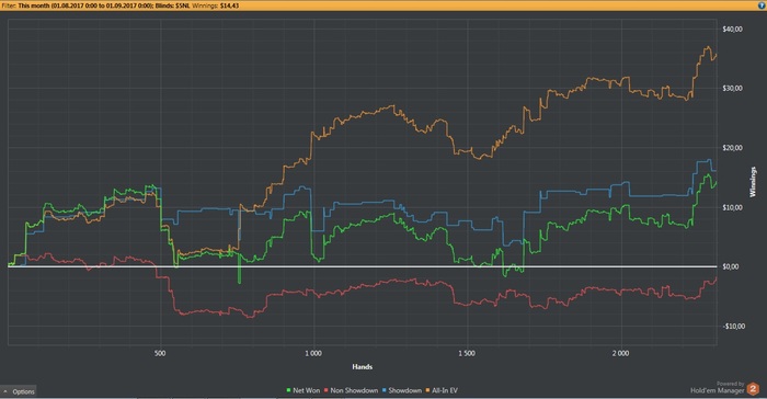 Пропустил я публикацию графика за прошлую неделю, поэтому выкладываю сейчас сразу за 2, а точнее от 7 июля. По правде говоря, за это время я хапнул даунстрик. Ощущение, как буд-то меня прокляли. В своей игре уверен и знаю, что делал в принципе достаточно плюсовые действия для данного лимита, но дисперсии похер на это. Поэтому и отыграл в районе полутора недель в ноль. Пару сессий ночных было часов по 10-12, утром смотрю результат...ноль... Грусть, тоска. Просто на НЛ5 я не привык к таким результатам. Ну а так, я то в принципе всё понимаю. Это еще не долго трепало меня. Поэтому я не расстраиваюсь. Главное откатать столько раздач, сколько я запланировал, а именно 75к.