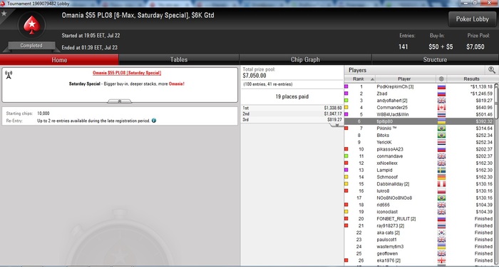 Всетаки воздух, хорошая компания и дзен дает свои плоды. Вроде не собирался играть на отдыхе- но суботне омании+ зрители желающие посмотреть мою игру вживую смотивровал на небольшую сессию. Заранее запланировал сыграть 4 тура 1. омания БЛ за 55 2. оманя пло 55 3. команя за 82 4. Бл за 22 Собственно результаты такие. Бл 55 и БЛ 22 завел в итм. и 2 финалки. тут зделал все что мог- пересидел Пикиники, потом запихался плоховато но плюсово по фишкам когда был короче в 3 раза чем любой за столом- поехало не ко мне но по ЕВ было плюсово. и потом вот так: это была очень сложная финалка практически на 100% состоящая з регов. 3 макс был вообще адовый -полтора часа , в какойто момент у меня было 1кк фишек против 250к+250к , а потом я каждого удвоил , одного будучи сверху другого снизу. Но со второго все таки вернул и поделил призовые- и тут усталостьсь сказалась выйдя с равными стеками по 45бб рассыпался рук за 10. Как то даже обидно 3 часа суммарно игралась финалка а ХА отдать за 10 рук. НУ и недобранного косаря жалко -никогда еще не терял 1к за 5 минут). Но в целом- результатом доволен. Продолжаю отдыхать)