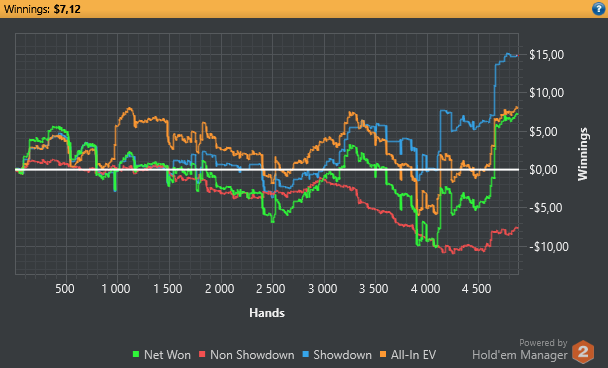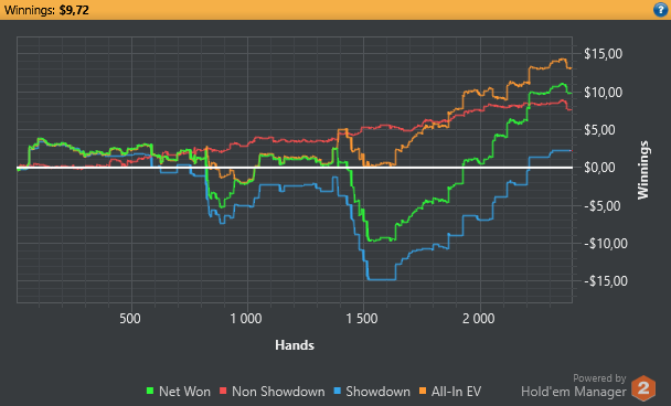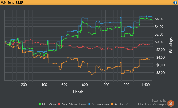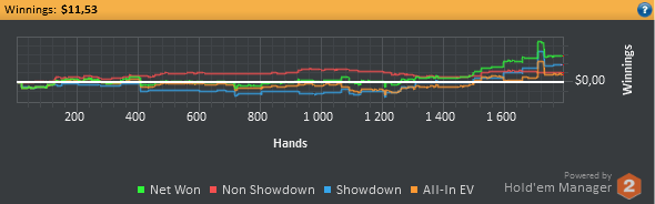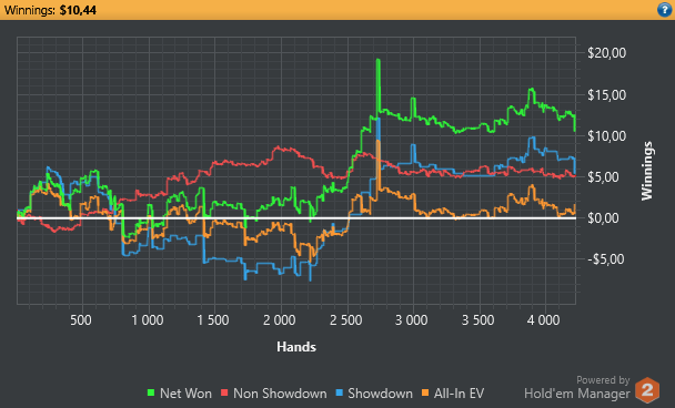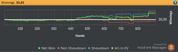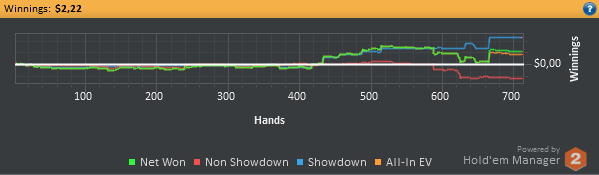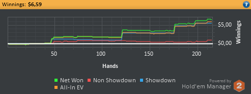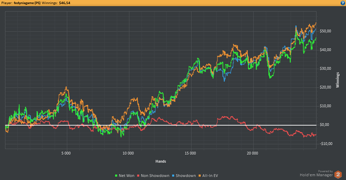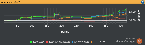 Катнул еще небольшую часовую сессию. +2.22$. Итого БР 98.52$. Короче мне понадобилось чуть больше чем 25к рук чтобы удвоить свой БР. Делаем небольшой перерыв и катаем последнюю на сегодня сессию.