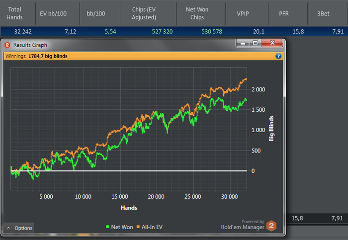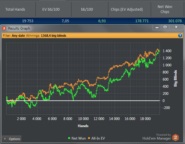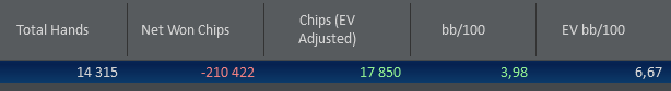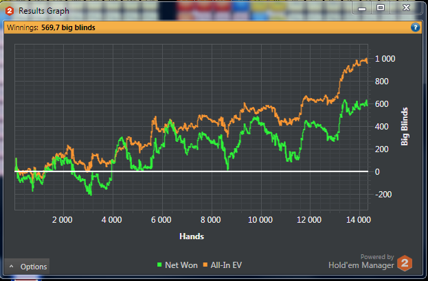 TiredOfRng, Дело пошло, вчера 3 финалки в 180,180, и 90-ке 3,4,5 места - и везде вылетел не по своей воле (JJ<88, АКs<А10, и в 3максе кулер закрыл open push с 12bb c 88 и нарвался на 99). Так что уже прилично вылез с минусов. Также с тренером провели две тренировки, одну индивидуальную разобрали много чего, много советов получил. Тренер сказал, что двмгаюсь в правильном направлении просто пока не складывается и дистанция вернет все (да и по бб недадает в 3раза, а по Chip EV уже 135стеков стартовых недодача - это говорит что много переезжают в поздних стадиях - отсюда и отрицательный профит, так что все будет норм думаю, малая дистанция откатаю 1000 туров думаю там уже будет ++++)