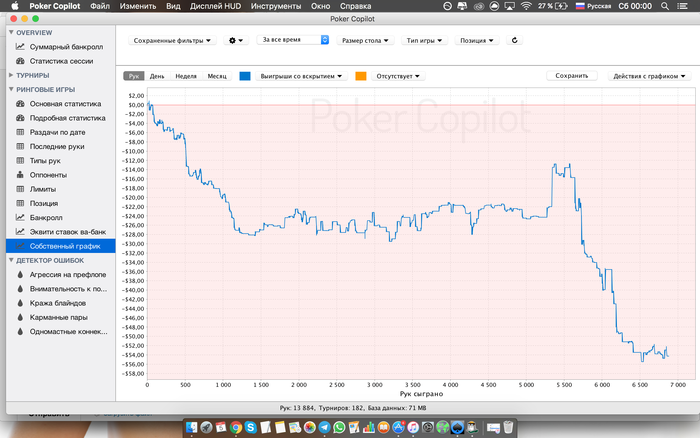 Такой вот момент сегодня был. По всей покерной математики я не должен был не в коем случае так делать. Но я знаю, что оппонент - рег, он просто так свои блайнды не отдает: часто рестилит. Что вы скажите по этому поводу? Следует ли блефовать вообще в покере, опираясь на какие-то свои ощущения? После этих размышлений, я открыл свой график и увидел, что у меня по красной линии все в плюс. Правда по синий - пздц))