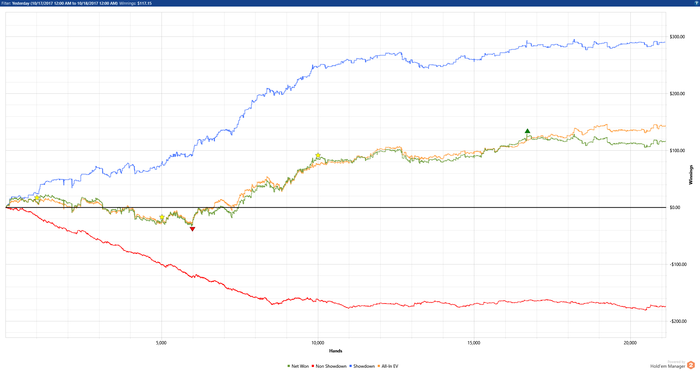 Сегодня делаю выходной. ну или по крайней мере до вечера. че-то уже подташнивать от покера начинает. а, как известно, работу нужно любить Понял главную свою ошибку - сажусь катать спустя 15 минут после того, как поднялся с кровати. и, скорее всего, из-за этого первые 2 часа результаты вообще не очень. вчера ничего не менялось, катал как робот, только теперь ЕВ стала немного поприятнее. Вообще мне уже хватает бабла вернуться на свой лимит, но тогда зачем я писал про 500$ за неделю?)) осталось 2,5 дня, по кол-ву рук, наверное, не вложусь.