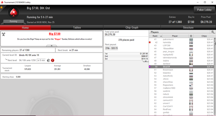 Cпасибо . С 3.50 решил приостановить затею - слишком геморойно это , да и эмоций маловато, турниры поэтому в приоритете на данный момент, хотя и ОЧЕНЬ дисперсионны. Короче говоря буду чередовать. Постараюсь без спусков по -800 за неделю.