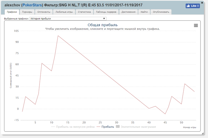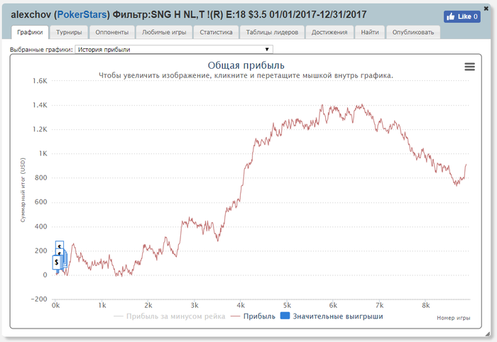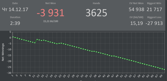 Годовой отчетик) если учесть, что ровно год назад я играл 0,5 лимит 9махов, то прогресс точно есть) общий график за год ниже, это мой первый год регуляра. За этот год были и апчики как на трехах 45махов (после чего их и не играю, не суеверный, но ну его нафиг проверять, отберет или не отберет) и даунстрики как в основной дисциплине на трехах 18махов, занимался с двумя тренерами + брал курс групповых тренек, сам занимался. Понимание значительно выросло, но все равно чувствуется неуверенность во многих аспектах. Самый неудачный месяц был октябрь - в 0, самый удачный декабрь, 1,3к с бонусами и всем остальным профитнул. Планы на 2018 год: 1) После окончания работы с фондом брать треньки у 6максера какого-нибудь, так как думаю это будет основной моей дисциплиной; 2) Когда буду уверенно себя чувствовать в основах покера, думаю где-то во второй половине 2018 года начать изучать концепции гто, учиться работать с прогами; 3) Так как 7 лимит уже стал основным, нужно пытаться подключать 15 лимит, но опять таки, ближе к лету думаю если все нормально сложится в плане обучения и самой игры; 4) Похудеть за следующие 2 месяца на 13кг, сейчас вес 93кг...хотя чуть больше года назад был 80...Вроде и тренируюсь, но малоподвижный образ жизни в зимнее время + потребление пищи в больших количествах, особенно сладкого, дали свой эффект...