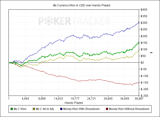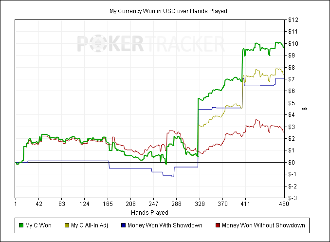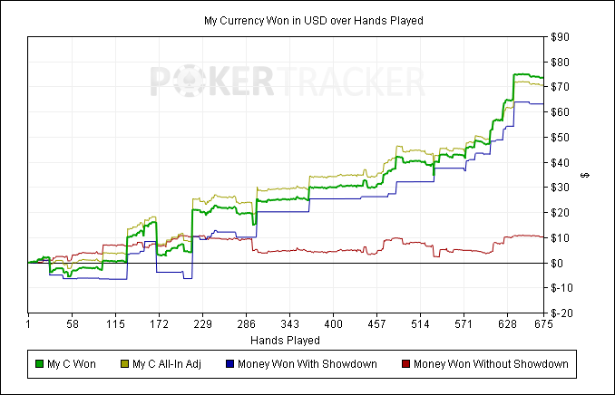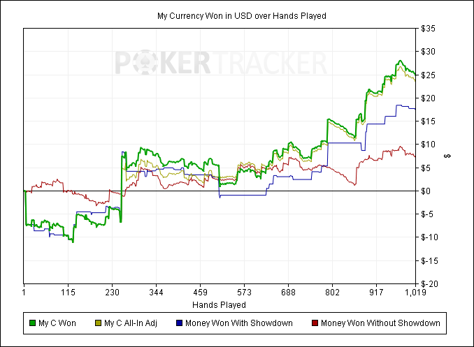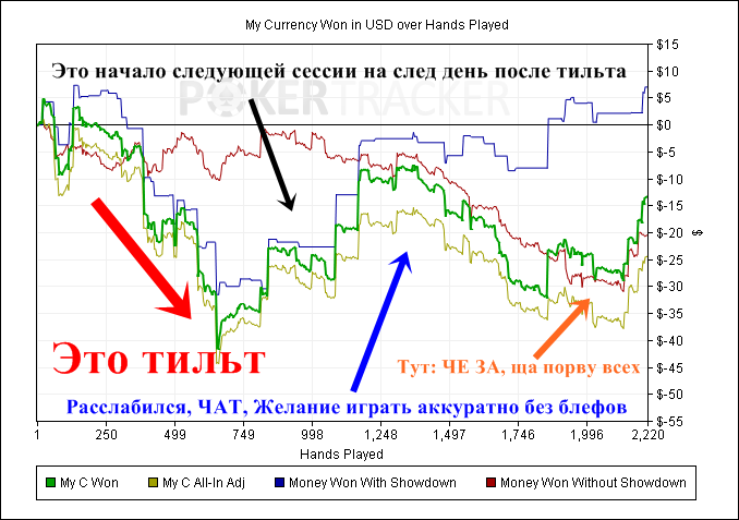 Вообще я большое внимание уделяю красной линии. потому что считаю, что хороший профит с двухзначным винрейтом делает именно он. Мелкие и средние банки (особенно средние) должны быть в плюсе именно благодаря красной. Нужно всегда искать хорошие ситуации для блефа, будь то рейз контбета или баррелинг при хороших ранаутах для этого. Поэтому когда начинаешь расслабляться играть всегда по карте плюсовать хорошо никак не получиться, что и подтверждает график в середине второй сессии. Блеф 3беты - баррелинг -чек рейзы = все это надо расширять ввиду того, что поле в таких спотах и ситуациях теряется, огромное фолд-эквити = автоприбыль. Вот. Сегодня стрима не будет.