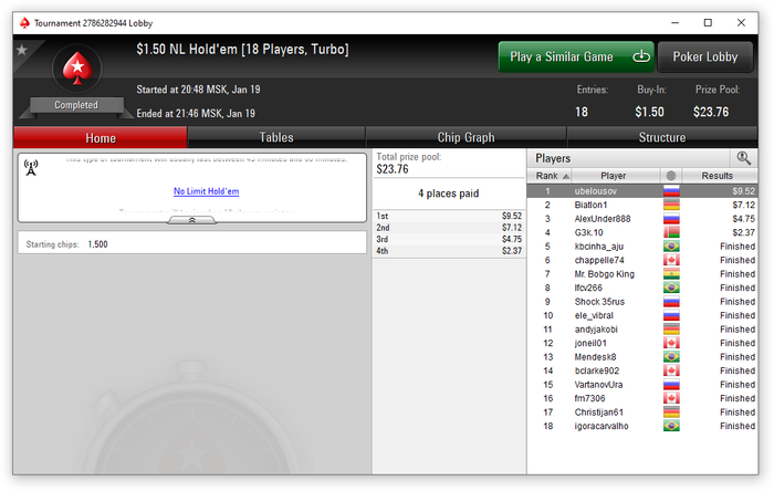 Как-то очень не складывалось на 1.5$ 45 макс, решил спуститься в них на 0.50$. Поиграл немного, там че то полный атас, убрал их вообще на данный момент. Сконцентрировался на 18 макс за 1.5$ и подключаю чуть-чуть МТТ за 0.55 на выстрел. И даже ничего, даже призы есть, хоть и минимальные. Заново открылся Hot турнир, ведь мы же умеем думаем, что умеем играть турбины. Каждый раз залезая в билдер за 0.55 пытаюсь понять, как там вообще играть. 8 тыщ человек, сидит толпа сумасшедших пошушащих и колящих 150+ бб все что угодно и даже им иногда приезжает. Зато весело.