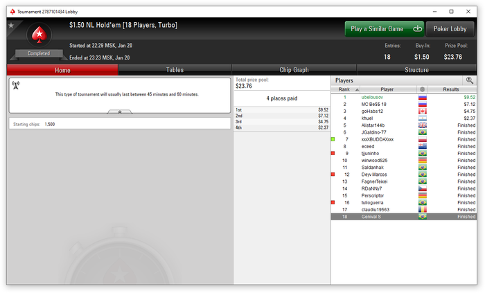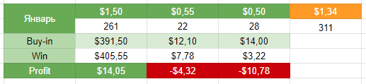 Итак, 20 дней января позади. 218 турниров из заявленных себе же 400+ в месяц. В начале месяца много потерял, потихоньку забираем обратно.