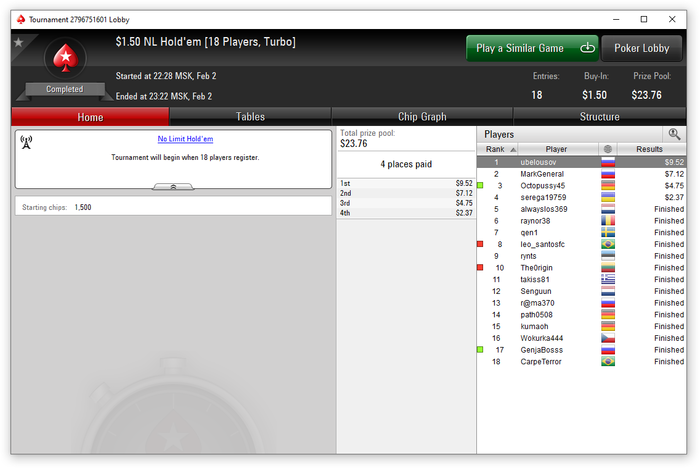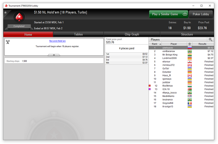 Что было понято? Полмесяца отбивал то, что потерял в первые полмесяца в итоге отбился почти в 0. Фух. Теперь опять сначала) Убрал нафиг 45 макс СНГхи, вообще. Если в 45-х за 1.5 еще что-то получалось, то потом я в них просел, решил попробовать по 0.5, чтобы подешевле, там просто хрень какая-то)) в итоге пока от них отказался. Сосредоточился только на 18-макс $1.5 турбиках, там и комфортнее и спокойнее. Плюс стал подключать МТТ по 0.55, в моем случае это ББ и Хот по 0.55, иногда биг. Успехов там пока не очень, хорошо хоть в призы прохожу. В ББ за 0.55 это вообще чемпионат по алл-инам любых карт в любые карты, поэтому это на выстрел.