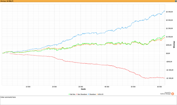 Итого отыграно 62056 рук, суммарный ВР на все лимиты 10,2 (9,58 по ЕВ), в деньгах 1056$ + рейкбэк, но я не считал сколько там получилось. БР на сегодняшний момент составляет 1466$.