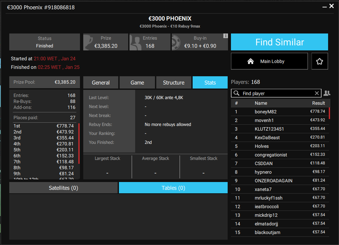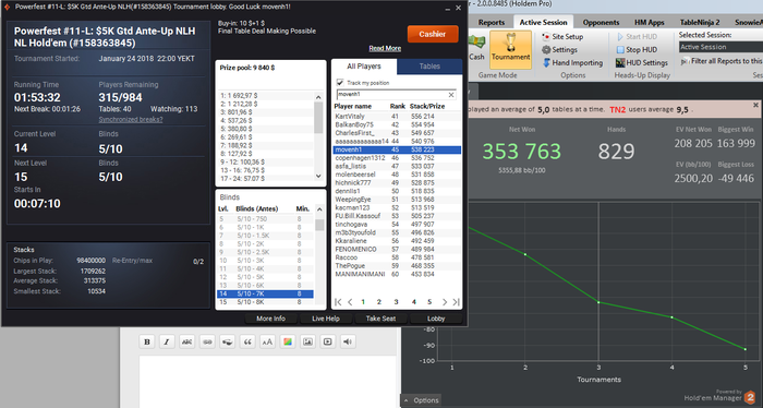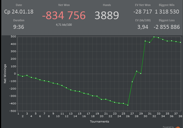 Остался один попкорн на виннере) Сегодня (-)315$. От мейка (-)1050, но есть 2 билетика по 1180$ на Сочи) Графон не радует)Турниров мало грузил, ибо на пати из-за изменений в сетки получилось всего 8 турниров,а не 15...Всем Спокойной ночи) Если таскану попкорн, напишу)