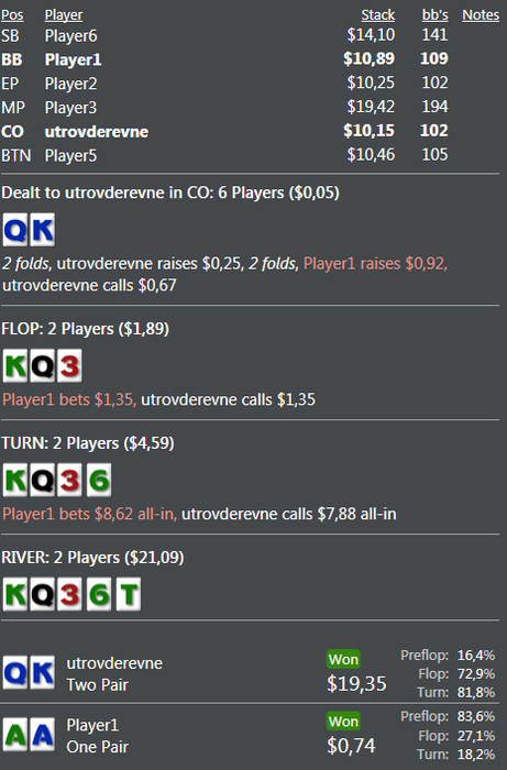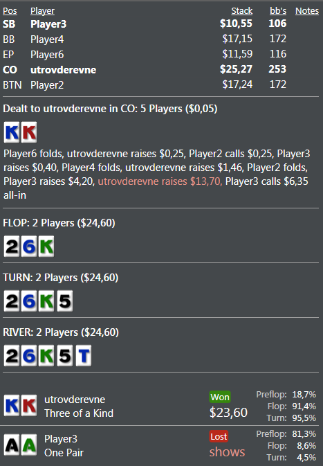 По поводу второй раздачи с KTs. Твой оппонент играет линию бет-бет-бет, в 3бет поте на скоординированной доске, стоит спросить - какие руки я бью и какие руки бьют меня? Мне в голову приходит лишь одна рука, которую мы бьём, это AK, да и то, далеко не всегда тут опп будет заряжать 3 барреля. На счёт тёрна спорно, но на ривере, для меня, 100% фолд, т.к. флеши мы не бьём, ФХ мы не бьём, и стрит лучше мы не бьём, бьём призрачную руку АК, которая там будет раз в сто лет.