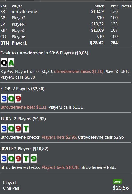 Вторая раздача, с AQ. Почему не ставишь второй баррель? Тут есть много рук с которых можно добрать и очень много дров. Чекая ты начинаешь играть в угадай мелодию, а именно: "флоатил он меня или нет?", ну а на ривере у нас уже не осталось никаких шансов понять его руку, как по мне, если это хороший рег, то это отличный пуш, как по мне, доска спарилась на ривере и закрылся флеш, а твоя линия: 3бет \ Бет \ Чек-колл \ Чек - очень слабо выглядит. Я бы играл префлоп и флоп так же, но на тёрне делал хороший вельюбет процентов 70-80 банка, ну а на ривере, либо чек пас (потому, что рейзить тут нас будут только руки лучше) либо блокинг-бет процентов 20-40, и на рейз отваливаться (опять же, руки слабже не зарейзят)