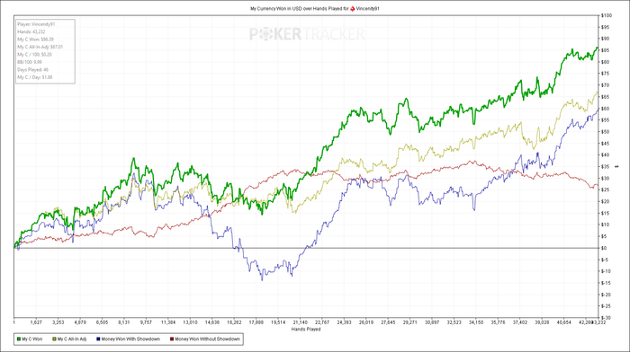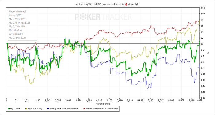 Планирую и дальше пока играть NL2. Скоро отобью бонусные 10 долларов. Где-то к этому моменту банкролл должен быть 120-130. Плюс бонусные 10 долларов. То есть, должно хватать на игру на НЛ5