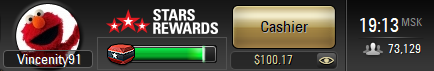 На покерном поприще всё достаточно грустно. Я отыграл около 10 тысяч рук примерно в 0. Таким образом, банкролл остался на месте (88 $). Похоже, 100 $ у меня получится набить только если я куплю в магазине 10 $ за 1000 StarsCoin