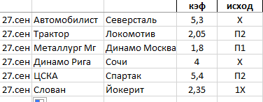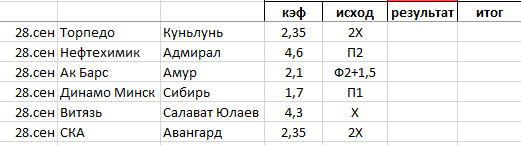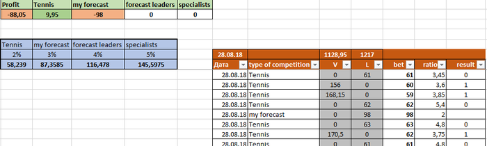Сделал себе программку в экселе. 1_Оставил для себя 4 направления для ставок 1.1_Настольный теннис 1.2_Мои прогнозы 1.3_Прогнозы сторонних бетеров 1.4_Прогнозы спецов 2_Таблицу ставок по направлениям для дальнейшего анализа 2.1 Сумма ставки 2.2 Кэф 2.3 Исход 2.4 Дата 3_Табличка учета 3.1 Общий профит 3.2 Профит по направлениям 4_Табличка для ставок 4.1 Процент ставки от банка по каждому направлению 4.2 Сумма ставки на данный момент
