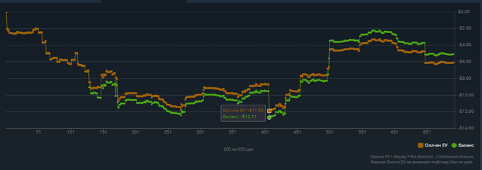 Сегодня играю 1 стол небольшими сессиями для закрепления позиций(стараюсь менять стол если вижу что много 3бетят 4бетят). Почему кстати баланс и allin ev так различается, типа переезды?) Не пойму кстати прикола с выводом средств при 60%, выгодно выводить?