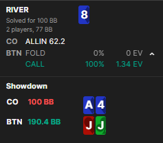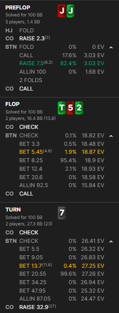 Но я так понял я не должен так делать с другим соперником(там могут быть TT KK QQ AA чаще всего?), просто на этого было наблюдение, что широко заходит. Но gtowizard говорит, что всё правильно(на флопе можно было чуть больше 8.25 BET вместо 5.45), хотя у меня ощущение что я вообще не должен был лезть в эту раздачу(если это вообще неизвестный игрок), если бы не нодс на оппонента. Может я как-то неправильно gtowizard читаю или мысли неверные по поводу не лезть в эту раздачу?