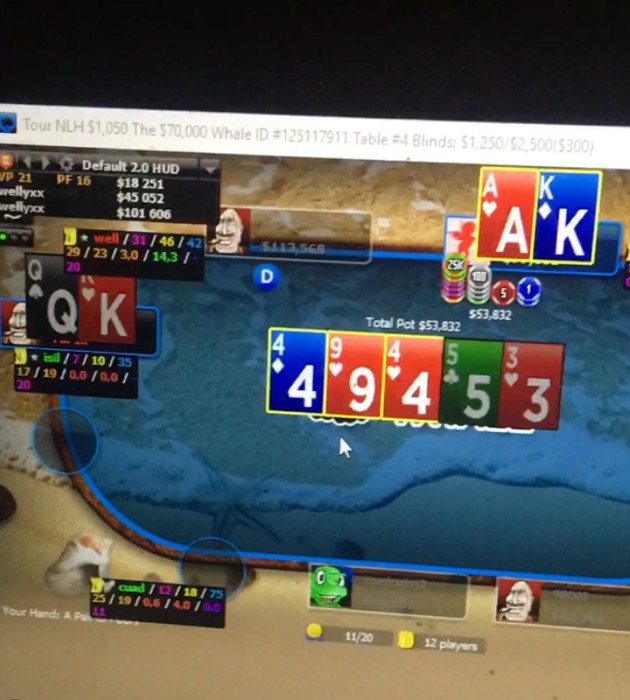 Далее со стеком 28bb я заколила против короткого на баттона и он жмакнул потбет на флопе и вколил оллин по КTo.