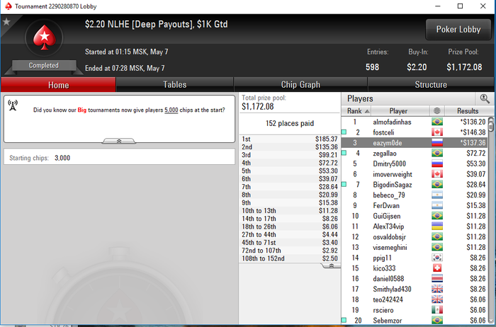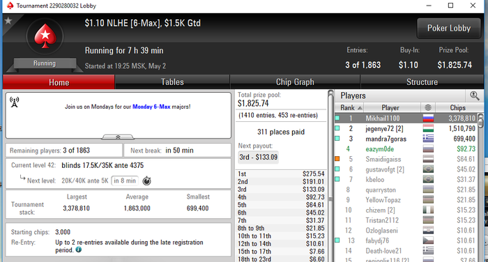 усыпаю, проснувшись топ2 было - 21,22$(11кнокаутов, до финалки играл как агро :)