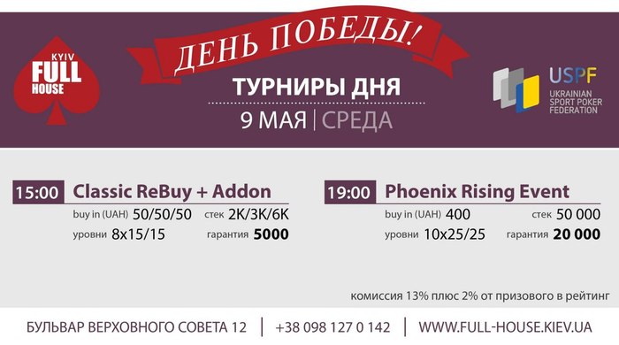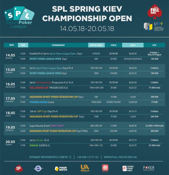 Свершилось, друзья! Большой покер возвращается в Киев. Совсем скоро, с 14 по 20 мая, в новом столичном клубе спортивного покера Full House Kiev стартует увлекательная серия, которую будет проводить Лига спортивного покера (SPL) под эгидой Всеукраинской Федерации спортивного покера. Все подробности - здесь!