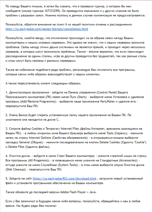 Также возникала аналогичная ситуация ,просто вылетал на 15 минут в дипе, где удачно сьели мои шашки и я остался огрызком сугубо по вине патипокера , как я понял такая проблема возникала хотя бы раз у каждого кто регулярно катает на пати , тут возникает 2 вопроса, будут ли они решать в ближайшее время этот вопрос технически , и будет ли предусмотрена в будущем с их стороны денежная компенсация в случае таких обрывов ,без решения этих вопросов о какой вообще конкуренции со старзами может идти речь? Я уже молчу о софте времен пещерного человека , хотя это уже вопрос второстепенный , у того же покергранта с бюджетом в несколько миллионов он выглядел гораздо привлекательнее и удобнее .Вместо того чтобы раздавать бесплатные билеты и тратить огромнейшие средства на рекламу и оверлеи сделайте что-то реально нужное и критически необходимое для игроков и своего развития как покер рума