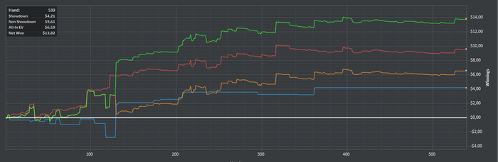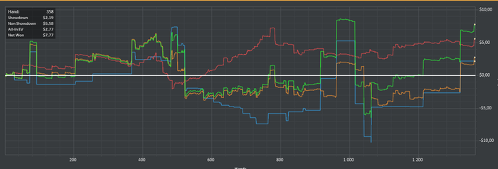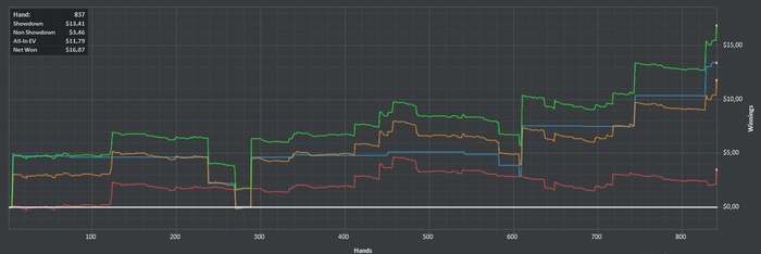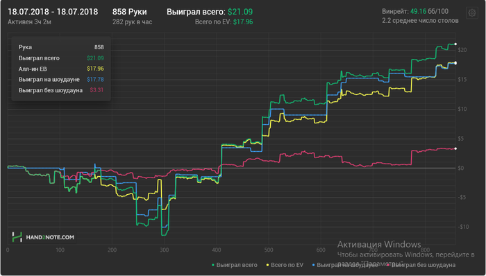 Сегодня была одна из лайтовых сессий за последнее время, деньги сами сыпались ко мне в руки. В итоге за 840 рук заработал +$16,87.