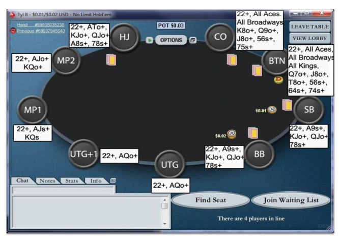 Отчет за сегодняшний день: 1427 рук, +$7,67. Как бы смешно это не звучало, но я "учусь заново ходить", опять 4 стола и игра строго по чарту. (ниже скину диапазоны по которым играю). Катаю за день несколько мини-сессий по 200 рук, что, кстати очень удобно, не так устаешь. Параллельно записываю все ошибки которые, на первый взгляд, возможно допустил.